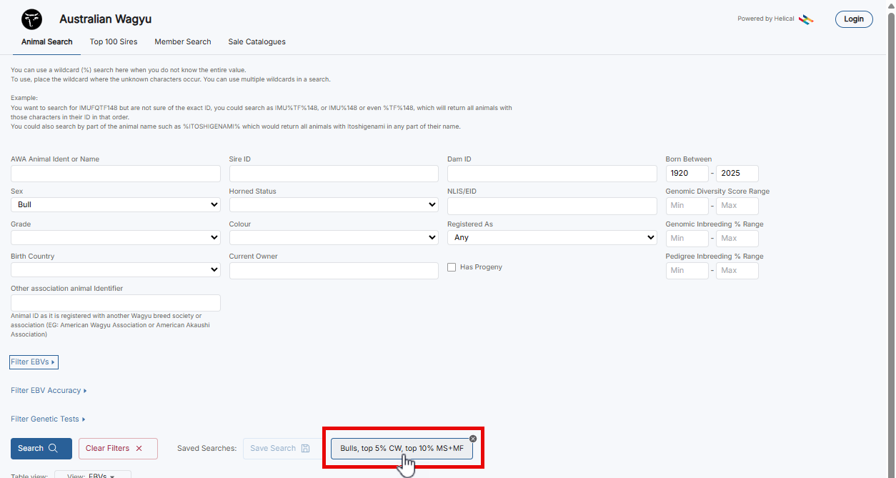 Members can also search and filter animals based on EBVs or Genetic Tests by dropping down the additional drop-down menus.