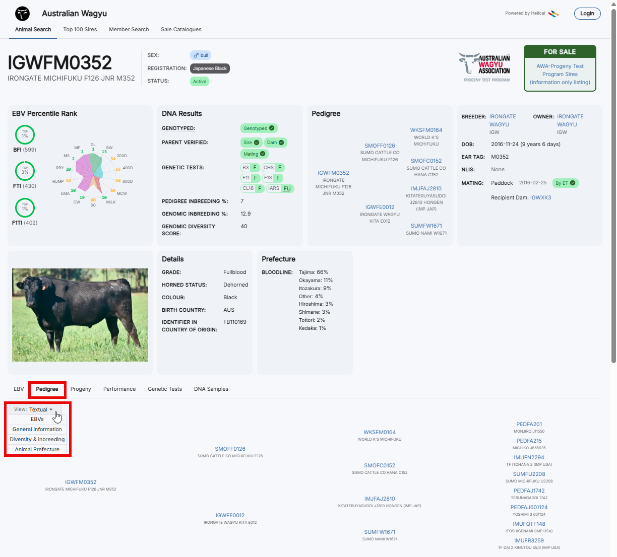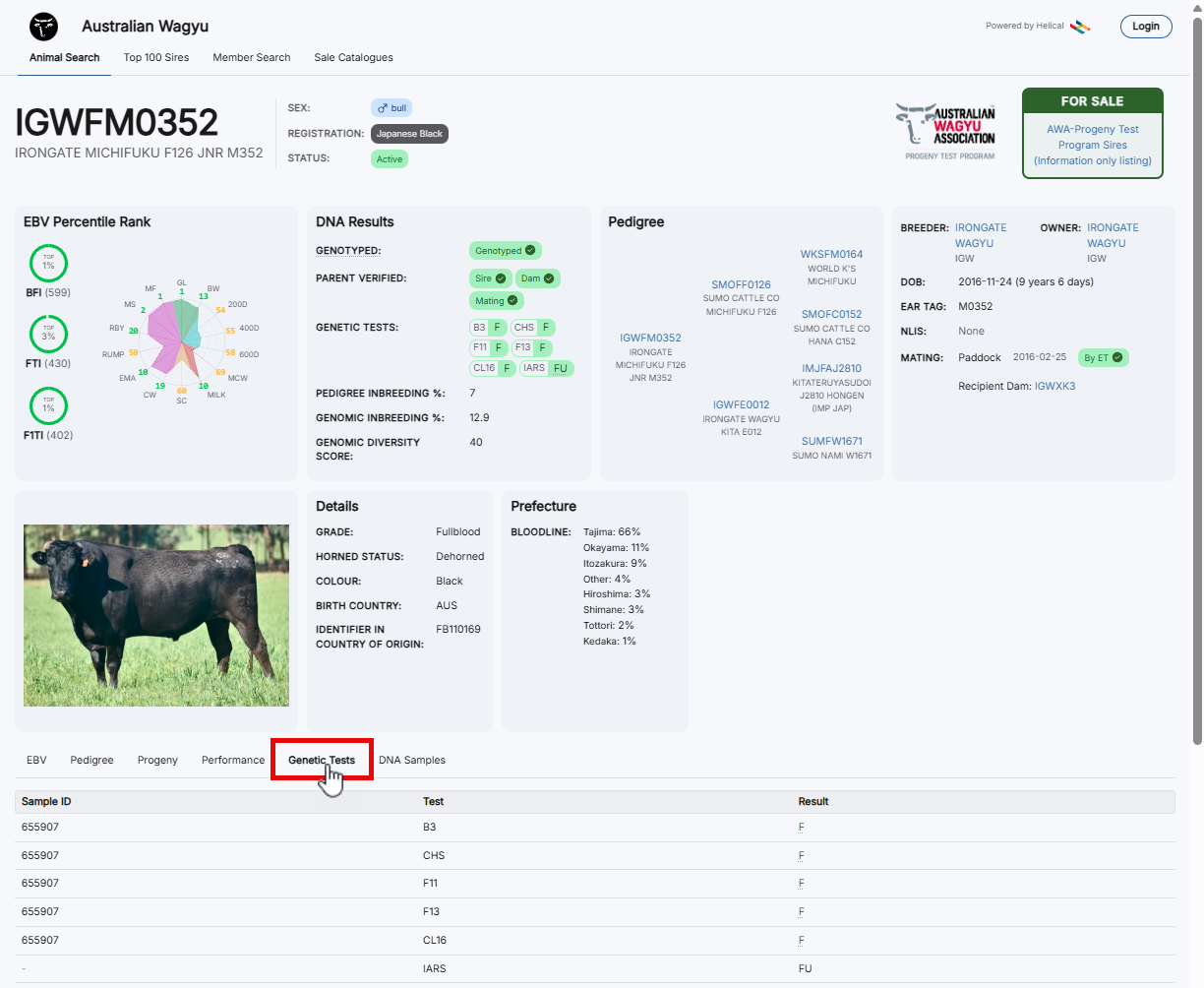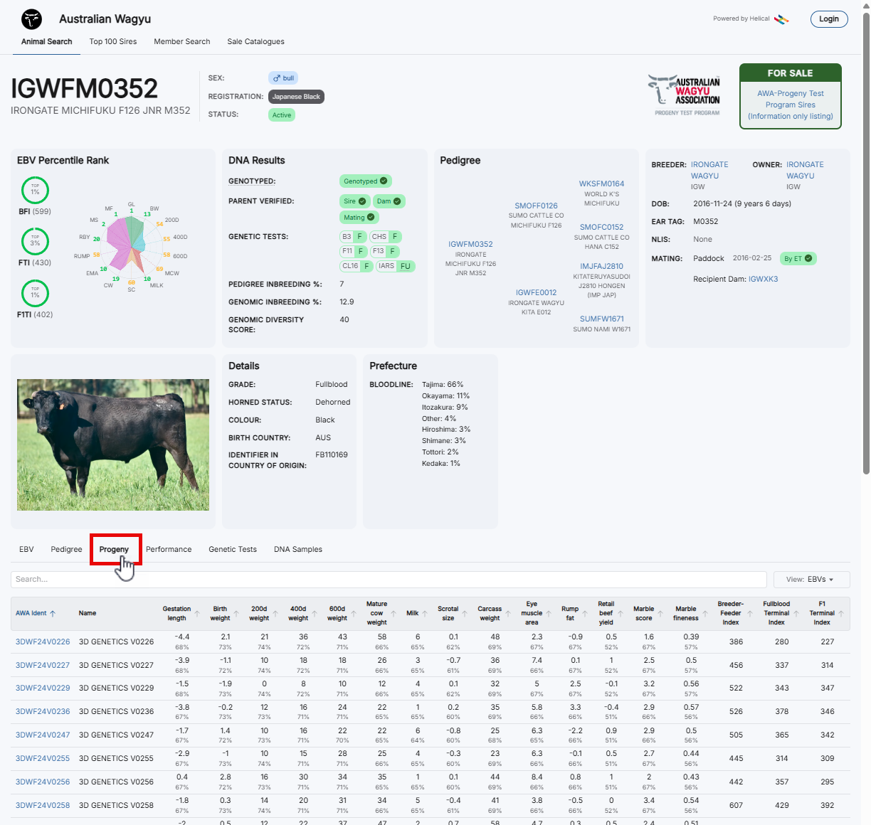 If the animal is for sale, or has genetic material for sale you will see a Green “FOR SALE” box appear at the top of the page with the name of the sale that will link you directly to the catalogue.