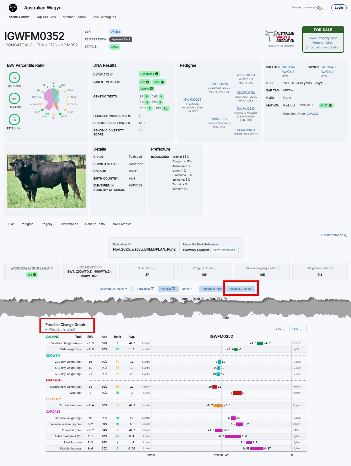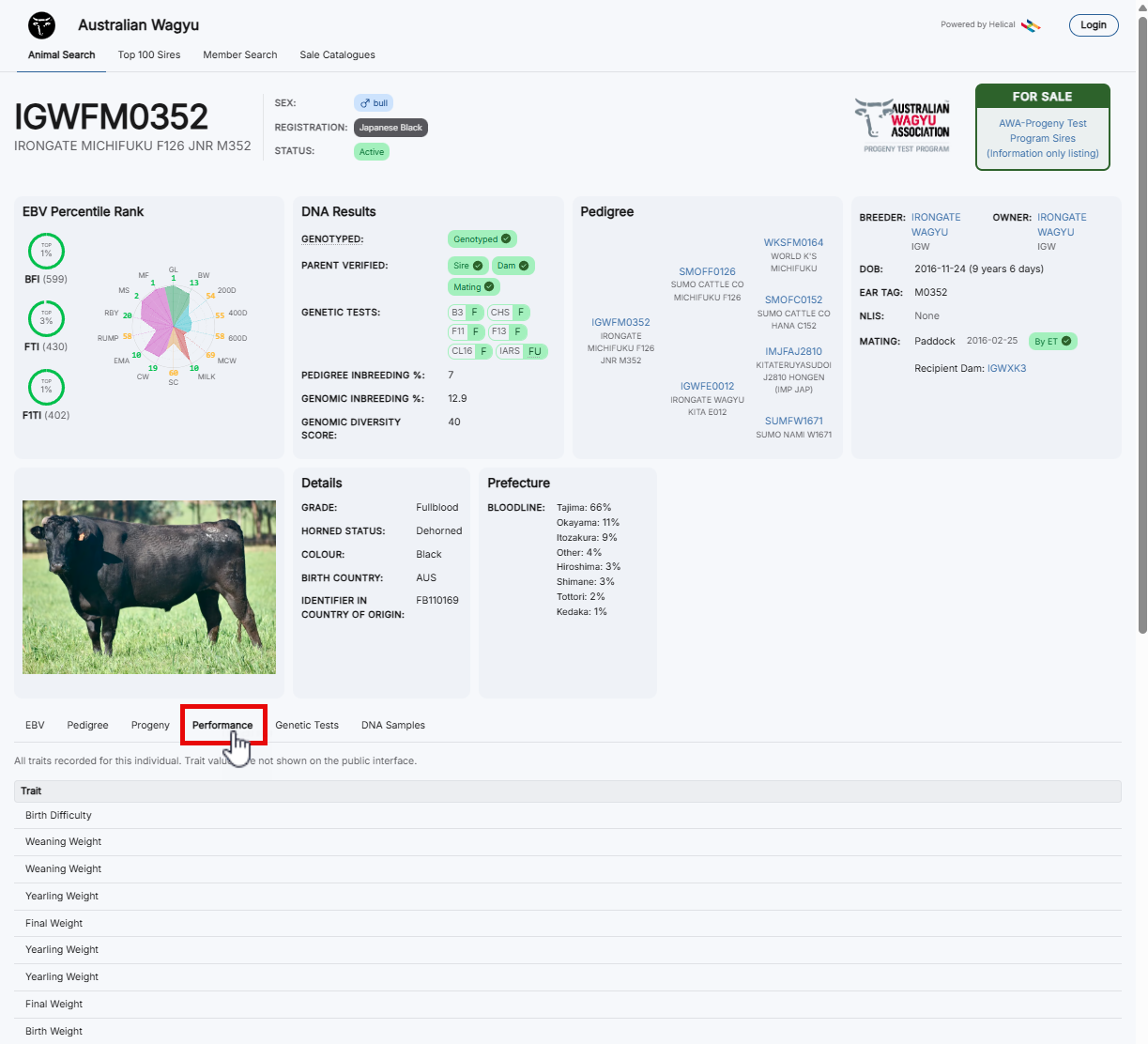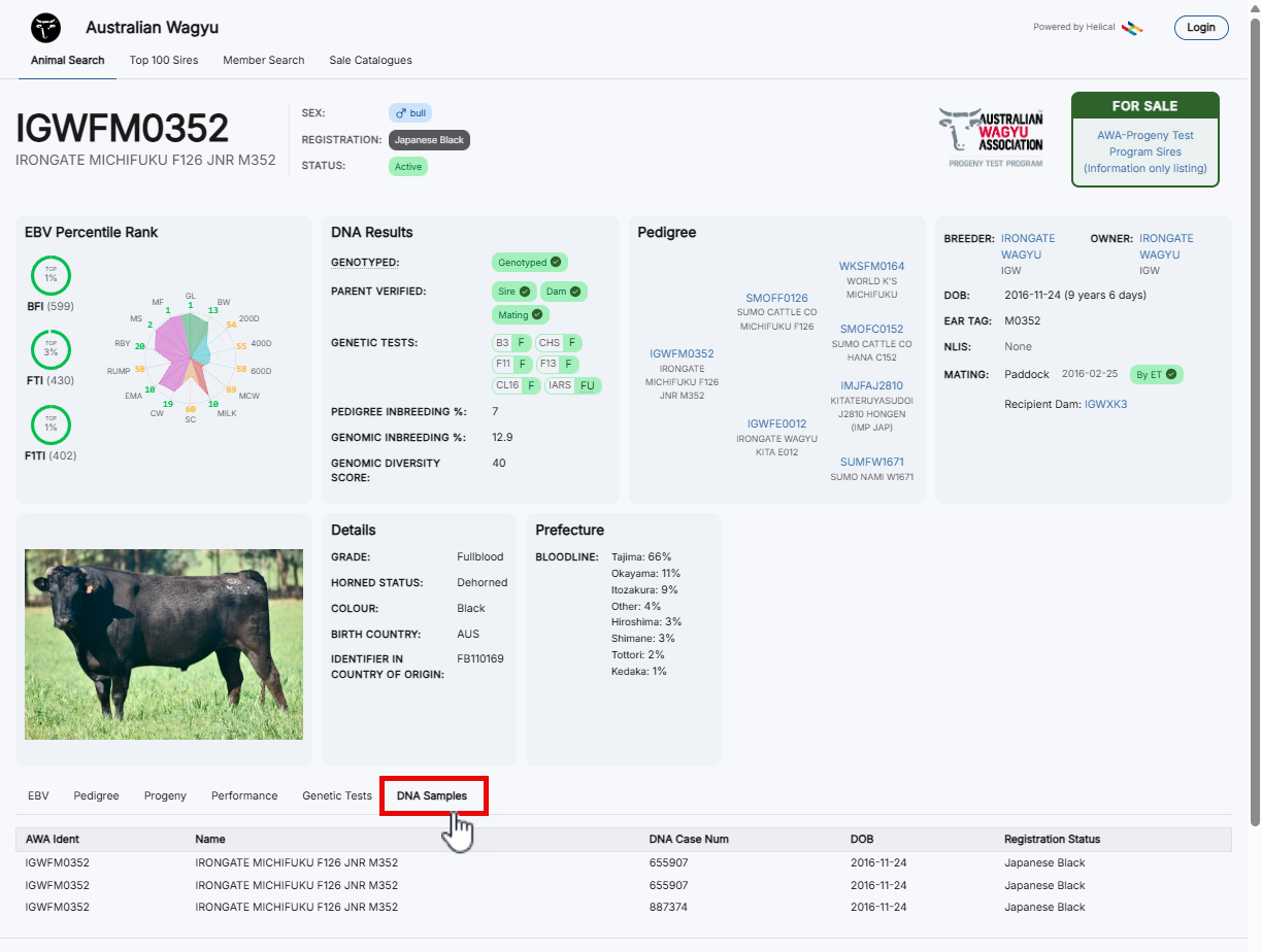 If the animal is for sale, or has genetic material for sale you will see a Green “FOR SALE” box appear at the top of the page with the name of the sale that will link you directly to the catalogue.