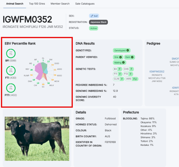 Once you do a search, you will also be able to toggle the data view to display different data depending on what you are interested in viewing – these include EBVs, general information, genetic diversity, and inbreeding and prefecture.