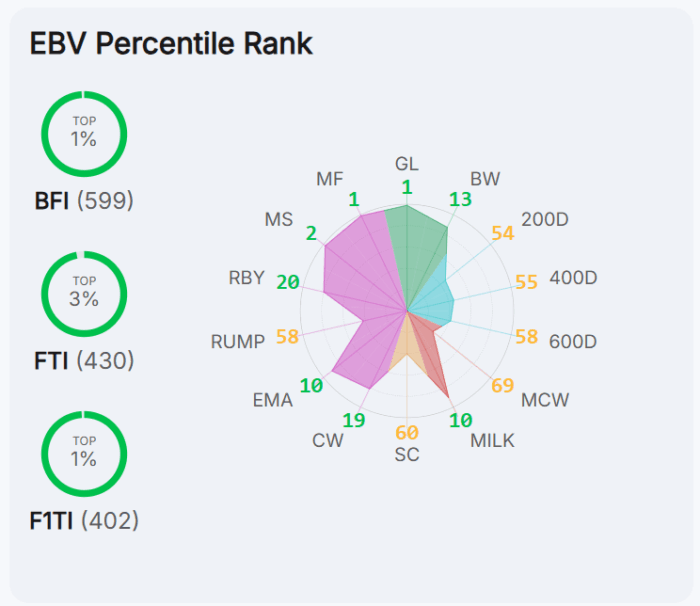 There is also an additional EBV display now at the top of the animal details page – the radar graph. This demonstrates the percentile tanking of the animal for the EBVs within the radar graph and shows the percentile rank in the green circles for the Indexes.