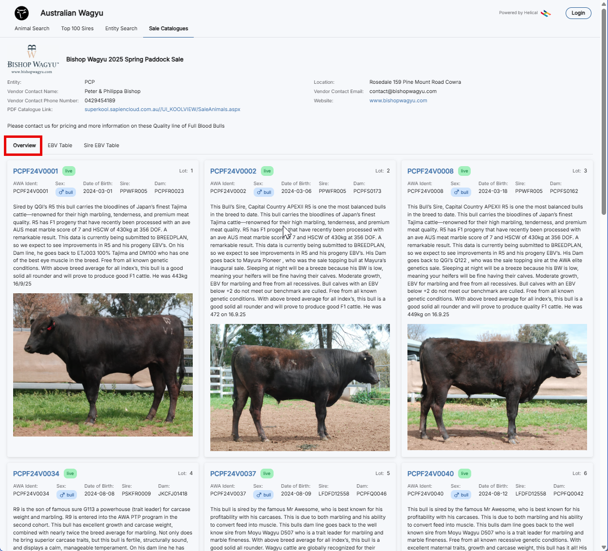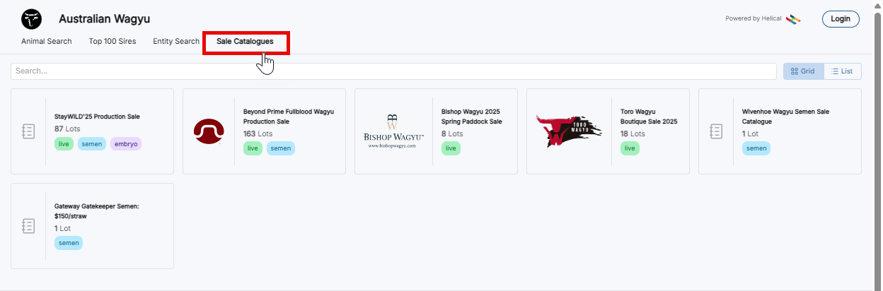 The catalogues will display with tabs as to whether there are live lots, semen lots, embryo lots, or a combination contained.