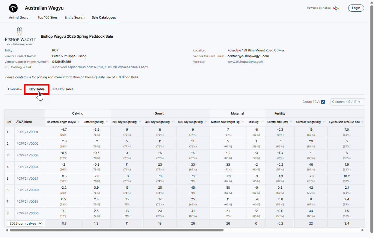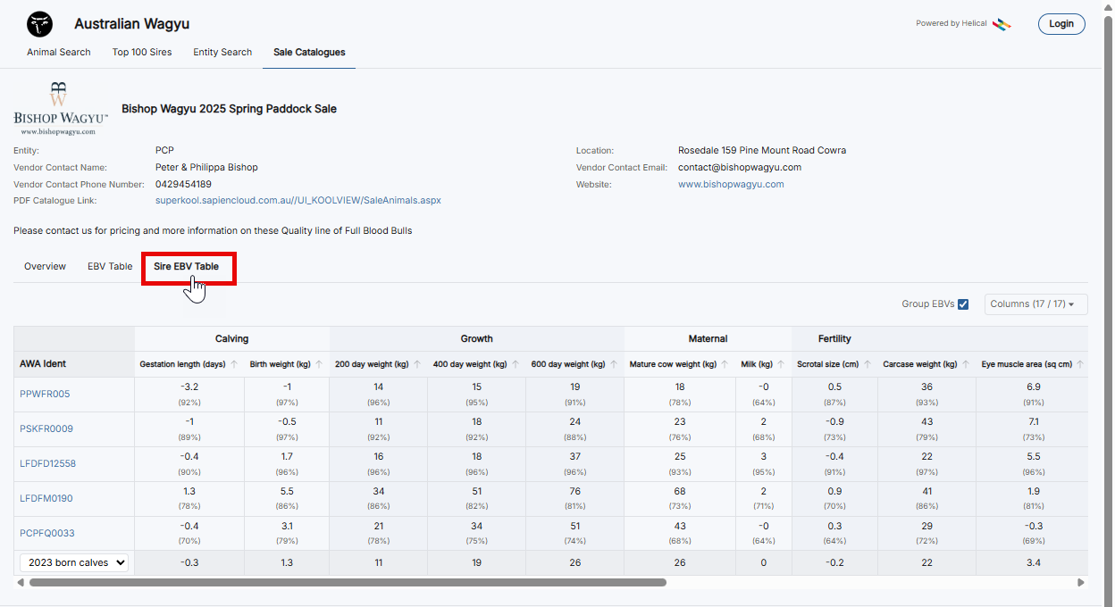To see EBVs for the animals within the sale, click on the “EBV Table” tab, or to see the EBVs for the sires of the animals, click on the “Sire EBV Table” tab.