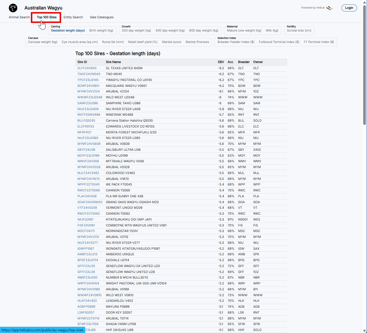 When you click on this tab you will be able to view the top 100 males in the breed for each trait and index.